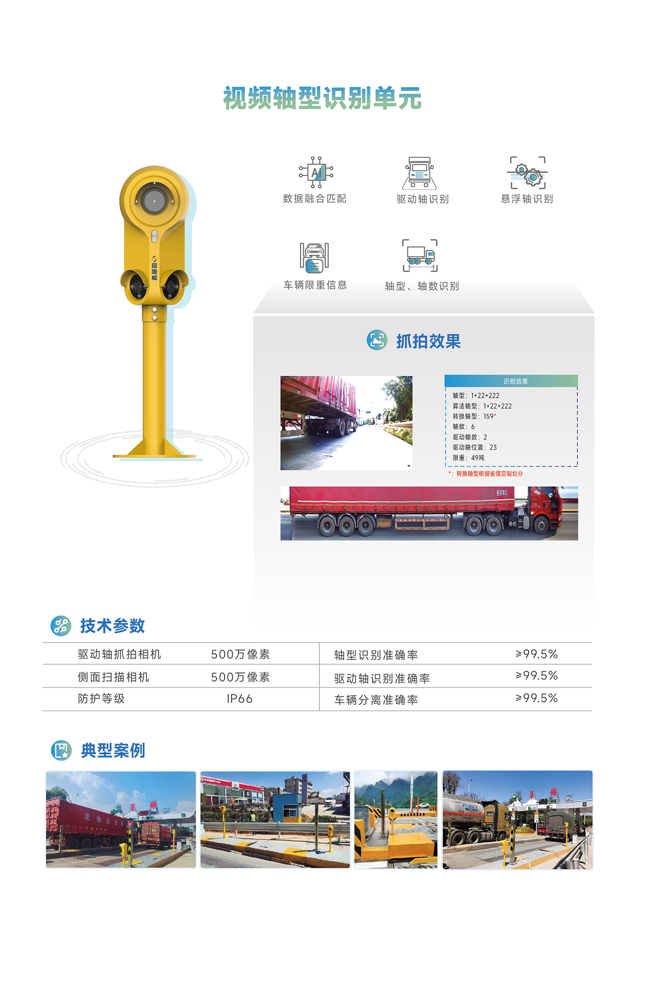 軸型識別系統(tǒng)主要由側(cè)面相面、前斜拍和后斜拍驅(qū)動(dòng)軸抓拍相機(jī)及多個(gè)補(bǔ)光燈組成,集圖像采集、圖像處理、圖像抓拍、車輛軸型/軸數(shù)/驅(qū)動(dòng)軸/懸浮軸識別于一體,輸出車輛最大允許總質(zhì)量限值,為收費(fèi)站入口拒超系統(tǒng)、出口復(fù)檢系統(tǒng)、國道超限檢測系統(tǒng)、源頭治超檢測系統(tǒng)等業(yè)務(wù)提供高精度的車輛信息判別及圖像證據(jù)。