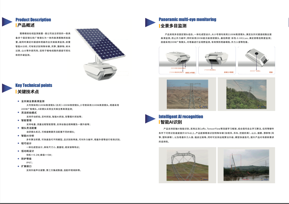 圖像微拍在線監(jiān)測裝置--是信路威自主研發(fā)的一款具備多個(gè)固定鏡頭和廣角鏡頭為一體的高清圖像抓拍裝置。能同時(shí)滿足對通道和塔基的全天候高清監(jiān)測。前置智能AI分析,可有效識別特殊車輛、風(fēng)箏、飄移物、樹木過高、山火等外部風(fēng)險(xiǎn),適用于輸電線路的通道可視化和防外破監(jiān)測。